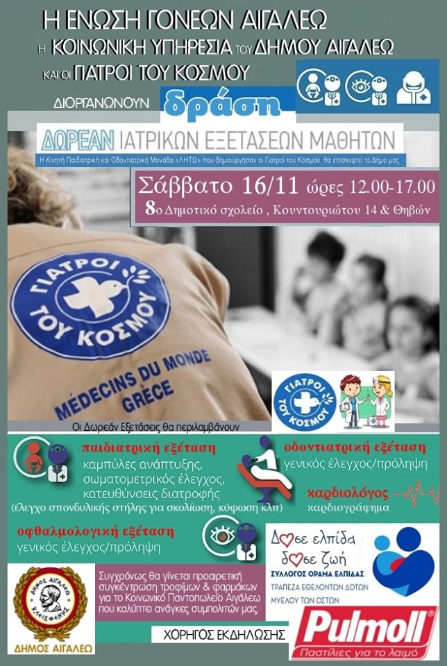 Η Ένωση Γονέων Αιγάλεω σε συνεργασία με τους Γιατρούς του Κόσμου και την Κοινωνική Υπηρεσία του Δήμου Αιγάλεω, διοργανώνουν, δράση δωρεάν προληπτικών ιατρικών εξετάσεων για μαθητές της περιοχής μας. Οι εξετάσεις θα περιλαμβάνουν δωρεάν παιδιατρική περίθαλψη, διαγνωστικό έλεγχο, οδοντιατρικό και οφθαλμολογικό έλεγχο, καρδιογράφημα, έλεγχο σπονδυλικής στήλης για σκολίωση, κύφωση καθώς και υπογραφή Ατομικού Δελτίου Υγείας Μαθητή (Α.Δ.Υ. Μ.)
