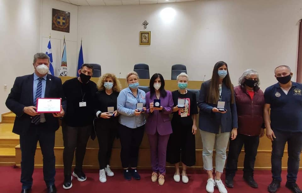 Τέλος, ο Δήμαρχος πρόσφερε αναμνηστικές πλακέτες του εμβλήματος του Δήμου Αιγάλεω, οι οποίες απεικονίζουν τον Κλεισθένη – πολιτικό του 6ου αιώνα π.Χ. – στους εκπροσώπους των πέντε σχολείων – εταίρων του προγράμματος.