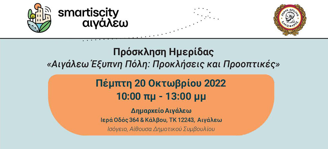 Ο Δήμος Αιγάλεω σας προσκαλεί στην 1η ημερίδα με τίτλο «Αιγάλεω Έξυπνη Πόλη: Προκλήσεις και Προοπτικές», που διοργανώνει στο πλαίσιο του έργου «Πιλοτικές εφαρμογές έξυπνης πόλης (Smart City) στον Δήμο Αιγάλεω, με έμφαση στην τοποθέτηση της περιοχής ως «νέου» προορισμού αναψυχής και πολιτισμού με αξιοποίηση βιωματικών εμπειριών πολιτών και επισκεπτών».
