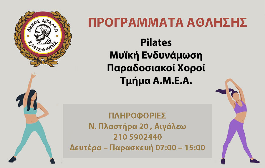 Ο Δήμος Αιγάλεω ανακοινώνει το πρόγραμμα των τμημάτων Αθλητισμού στην αίθουσα γυμναστικής του δημοτικού γηπέδου «Σταύρος Μαυροθαλασσίτης» (Θηβών 268), όπως διαμορφώνεται μετά και την ολοκλήρωση της διαδικασίας προσλήψεων Καθηγητών Φυσικής Αγωγής.