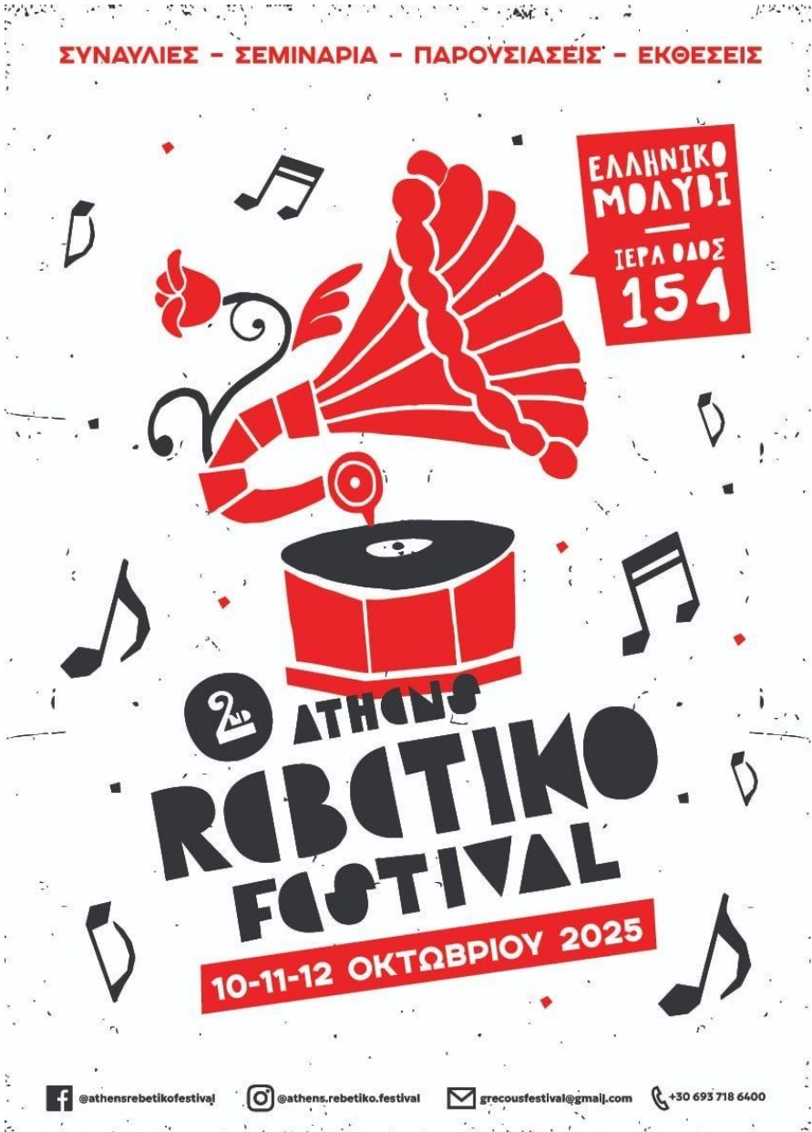 Ο Δήμος Αιγάλεω, στο πλαίσιο του Μήνα Αντιφασιστικών Δράσεων, παρουσιάζει το μουσικό δρώμενο «Αντιφασιστικό Ρεμπέτικο» – Νότες και στίχοι ενάντια στο σκοτάδι, σε συνδιοργάνωση με την ΑΜΚΕ Grecous, την Κυριακή 12 Οκτωβρίου 2025, από τις 17:00 έως τις 18:00, στο Πολιτιστικό Κέντρο «Ελληνικό Μολύβι» (Ιερά Οδός 154).
