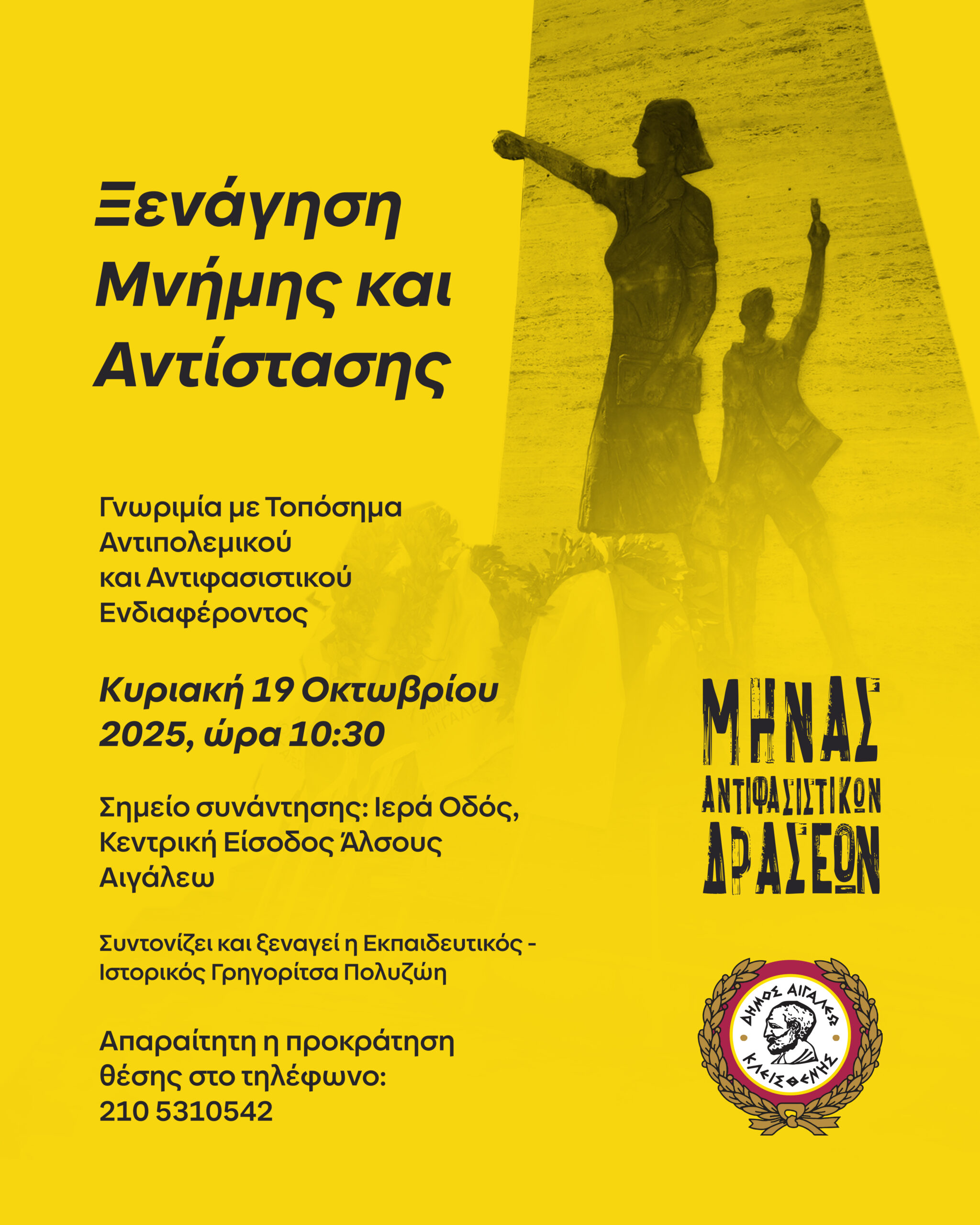 Ο Δήμος Αιγάλεω, στο πλαίσιο του Μήνα Αντιφασιστικών Δράσεων, διοργανώνει ακόμη μία ιδιαίτερη πρωτοβουλία που συνδυάζει τη γνώση, τη μνήμη και τον σεβασμό στην ιστορία του τόπου: την Ξενάγηση Μνήμης και Αντίστασης – Γνωριμία με Τοπόσημα Αντιπολεμικού και Αντιφασιστικού Ενδιαφέροντος, η οποία θα πραγματοποιηθεί την Κυριακή 19 Οκτωβρίου 2025, στις 10:30, με σημείο συνάντησης την Ιερά Οδό, Κεντρική Είσοδο του Άλσους Αιγάλεω.
