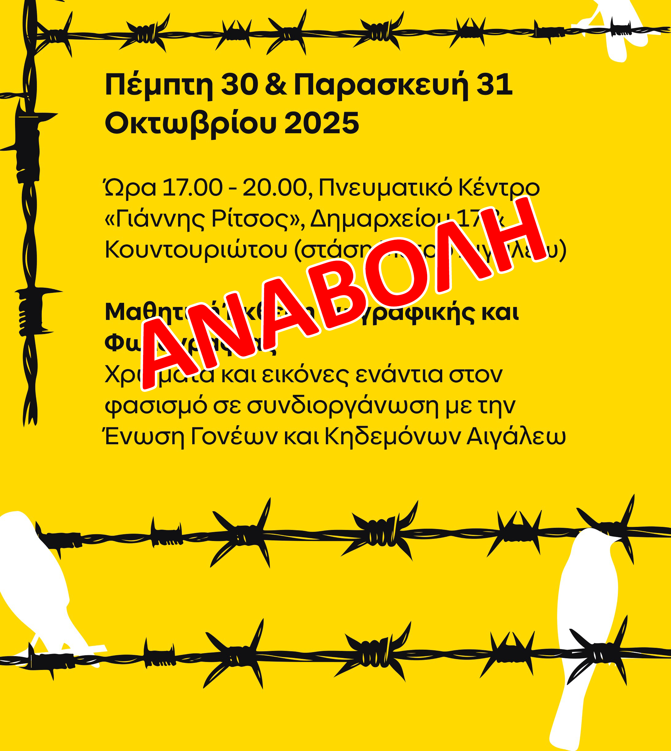 Ο Δήμος Αιγάλεω ενημερώνει ότι η προγραμματισμένη Μαθητική Έκθεση Ζωγραφικής και Φωτογραφίας «Χρώματα και εικόνες ενάντια στον φασισμό», που επρόκειτο να πραγματοποιηθεί στο πλαίσιο του «Μήνα Αντιφασιστικών Δράσεων» στις 30 & 31 Οκτωβρίου 2025 στο Πνευματικό Κέντρο «Γιάννης Ρίτσος», αναβάλλεται για μεταγενέστερη ημερομηνία.