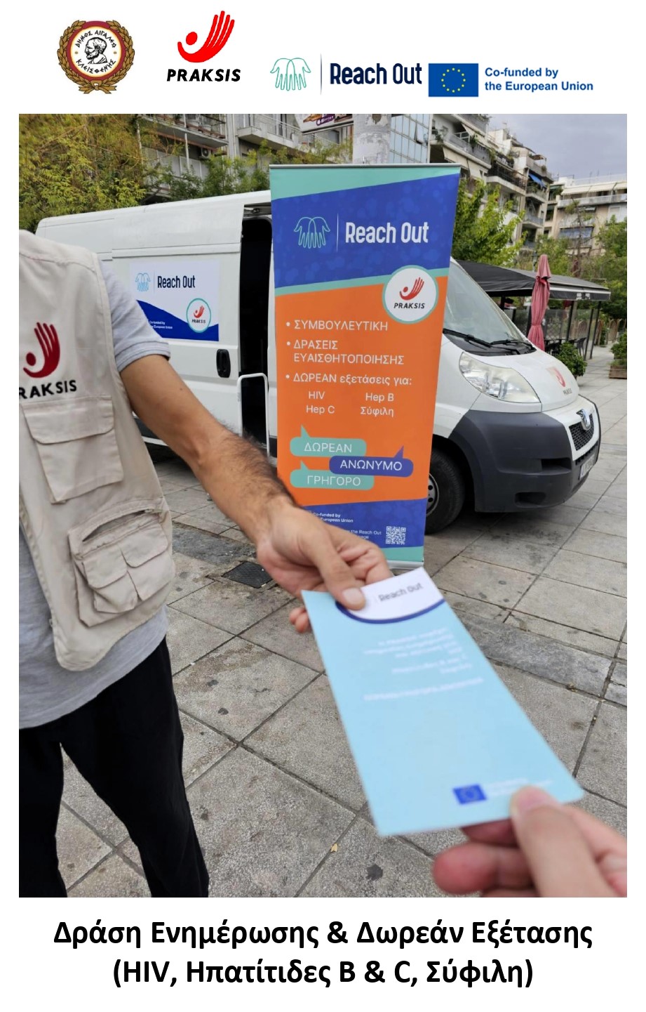 Στη δράση, η οποία υλοποιείται στο πλαίσιο του Ευρωπαϊκού Έργου Reach Out Integrated community healthcare and out-reach services for hard-to-reach populations, με συγχρηματοδότηση της Ευρωπαϊκής Επιτροπής, κάθε ενδιαφερόμενος/η θα έχει τη δυνατότητα να υποβληθεί σε γρήγορο τεστ ανίχνευσης αντισωμάτων για τον HIV, τις Ηπατίτιδες Β & C και τη Σύφιλη.