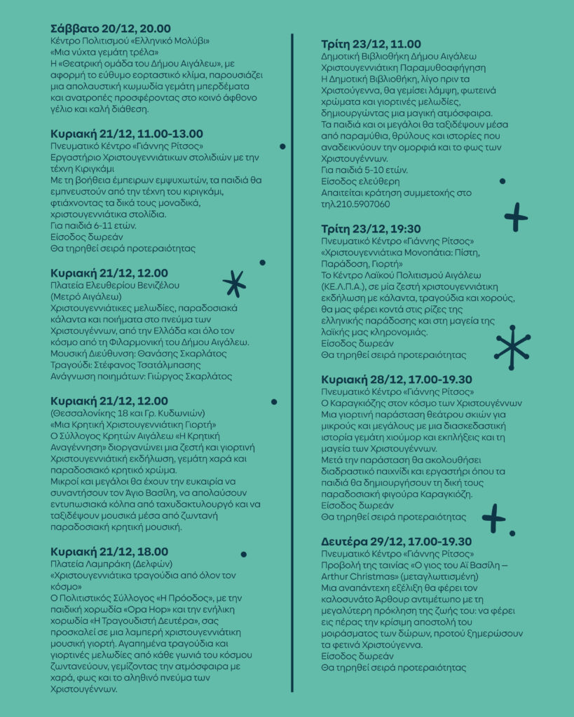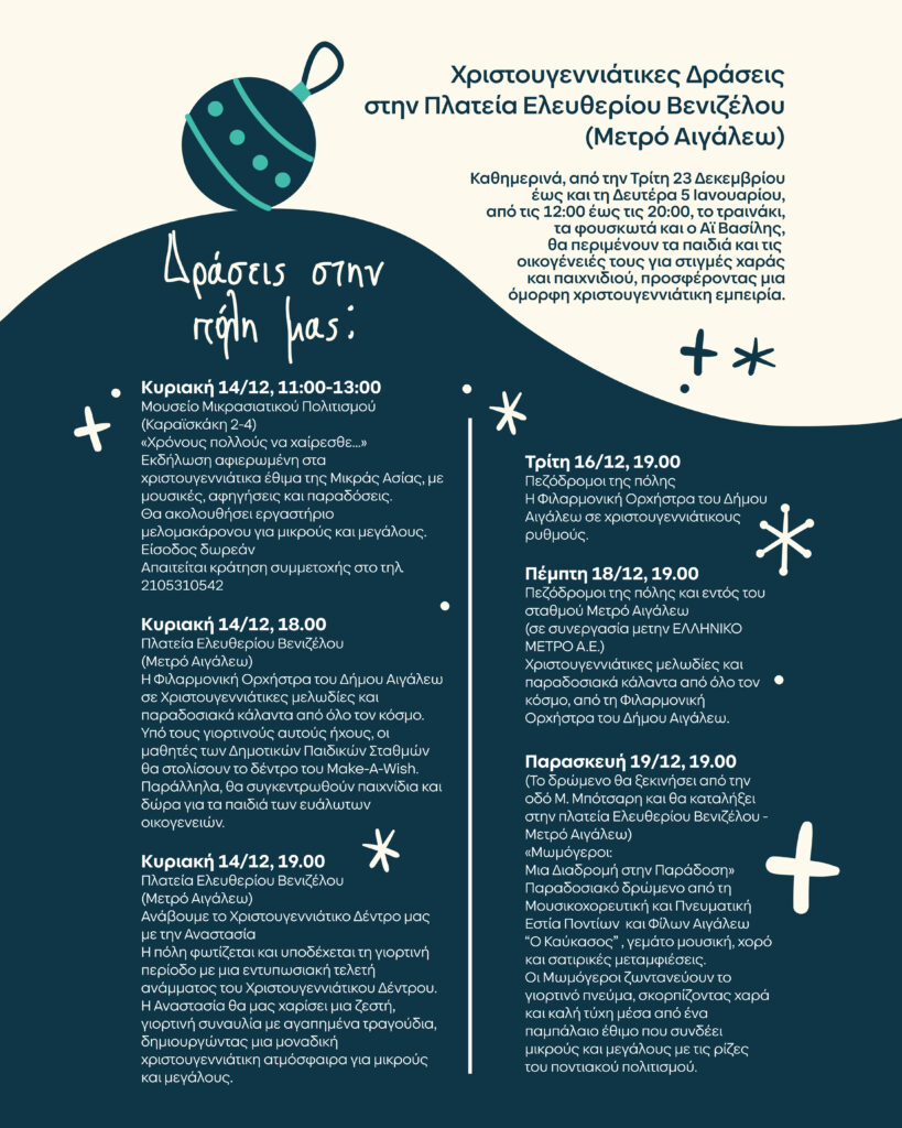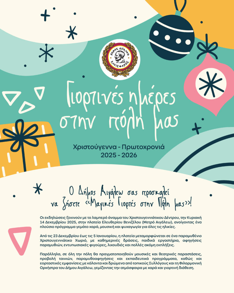 Από το Σάββατο 14 Δεκεμβρίου 2025 έως και τη Δευτέρα 5 Ιανουαρίου 2026, μουσικές και θεατρικές παραστάσεις, προβολές ταινιών, παραμυθοαφηγήσεις, εκπαιδευτικά προγράμματα για παιδιά, καθώς και εορταστικές εμφανίσεις με κάλαντα και δρώμενα από τοπικούς Συλλόγους και τη Φιλαρμονική Ορχήστρα του Δήμου Αιγάλεω, θα δώσουν ζωντάνια σε κάθε γειτονιά, δημιουργώντας μια ζεστή και χαρούμενη γιορτινή ατμόσφαιρα για μικρούς και μεγάλους.