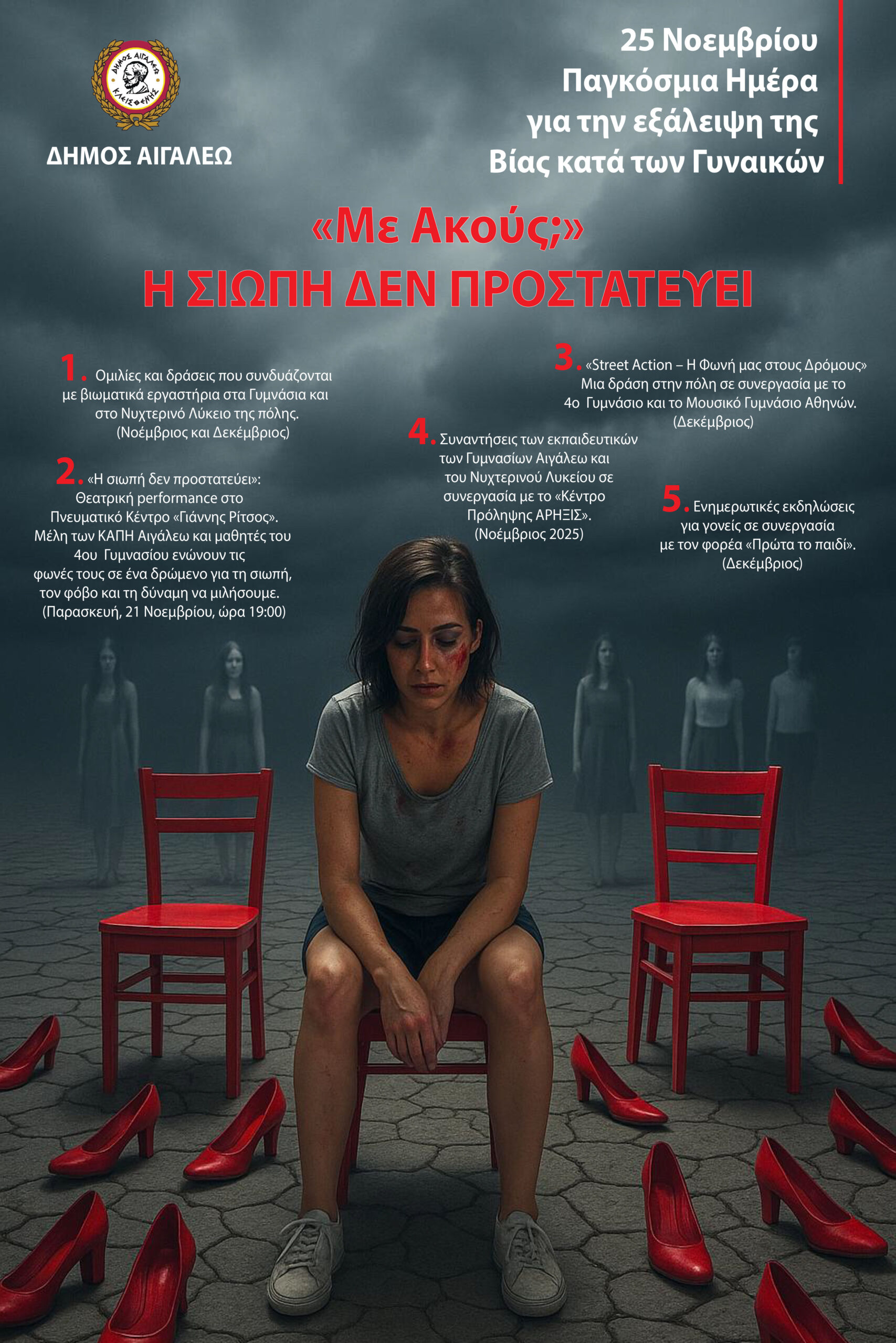 Ο Δήμος Αιγάλεω, μέσω της Διεύθυνσης Κοινωνικής Προστασίας, η οργάνωση Πρώτα το Παιδί και η Ένωση Γονέων και Κηδεμόνων Αιγάλεω συνδιοργανώνουν μια σημαντική εκδήλωση ενημέρωσης και ευαισθητοποίησης σχετικά με την έμφυλη βία, ένα ζήτημα που αγγίζει βαθιά τον κοινωνικό μας ιστό και απαιτεί συλλογική επαγρύπνηση.