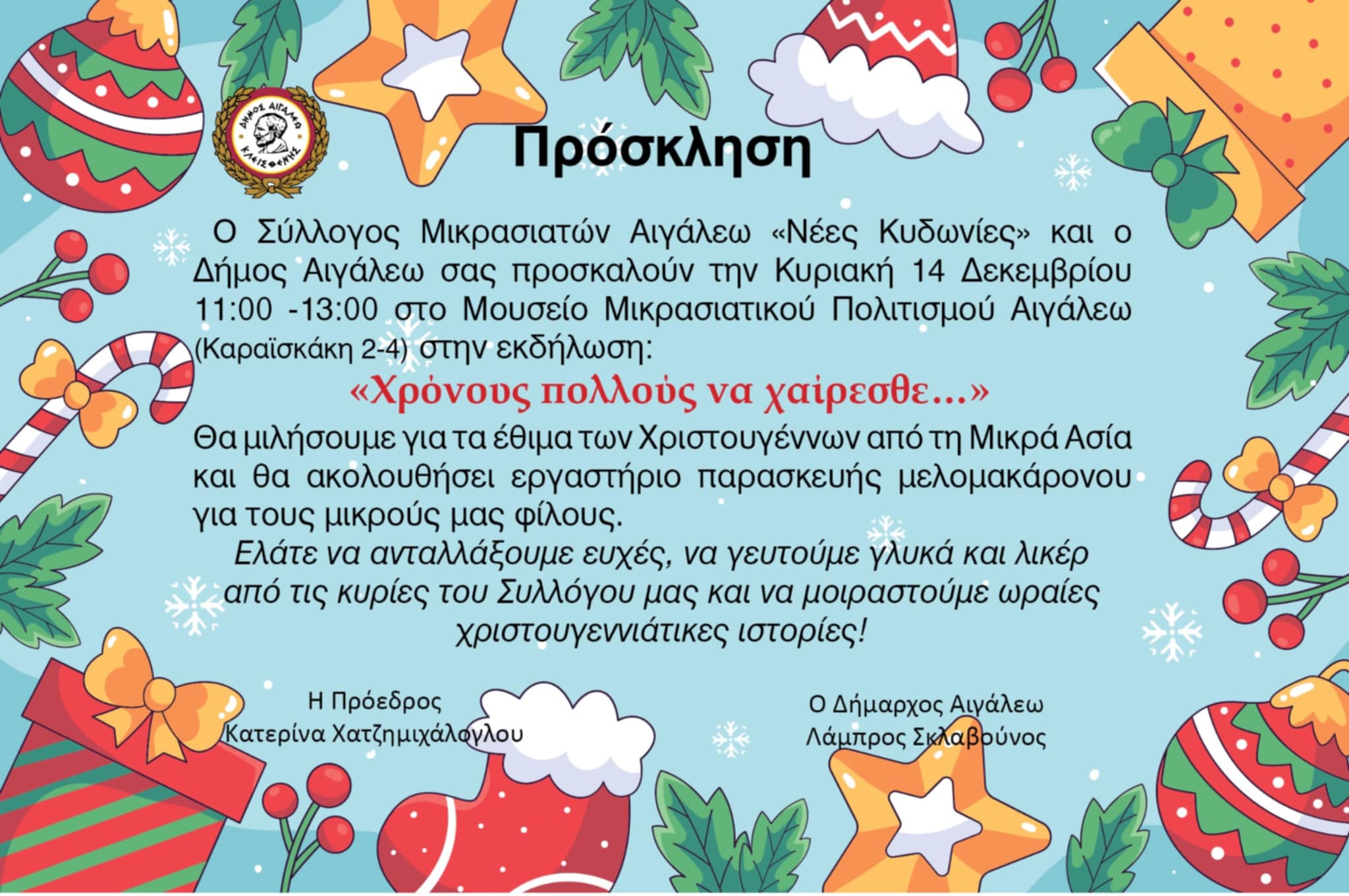 Ο Δήμος Αιγάλεω και ο Σύλλογος Μικρασιατών Αιγάλεω «Νέες Κυδωνίες» ανοίγουν τις «Μαγικές Γιορτές στην Πόλη μας» με μια ζεστή και συμβολική δράση, αφιερωμένη στη μνήμη, στις παραδόσεις και στη διαγενεακή σύνδεση που κρατά ζωντανή την ταυτότητα και την ιστορία μας.