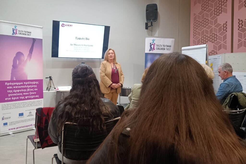Κεντρική ομιλήτρια ήταν η Δρ. Μαργαρίτα Καραβέλα, Συμβουλευτική Ψυχολόγος, Ομαδική Ψυχοθεραπεύτρια και συνεργάτιδα του Δικτύου Κέντρων Πρόληψης και Ψυχοκοινωνικής Υποστήριξης (ΔΙ.ΚΕ.ΨΥ.), η οποία ενημέρωσε και συζήτησε με γονείς και κηδεμόνες για το τι είναι η έμφυλη βία, πώς αναγνωρίζεται, πού μπορούν να απευθυνθούν όσοι χρειάζονται υποστήριξη, καθώς και για τον ρόλο των ενηλίκων στην ενημέρωση και ενδυνάμωση των παιδιών.
