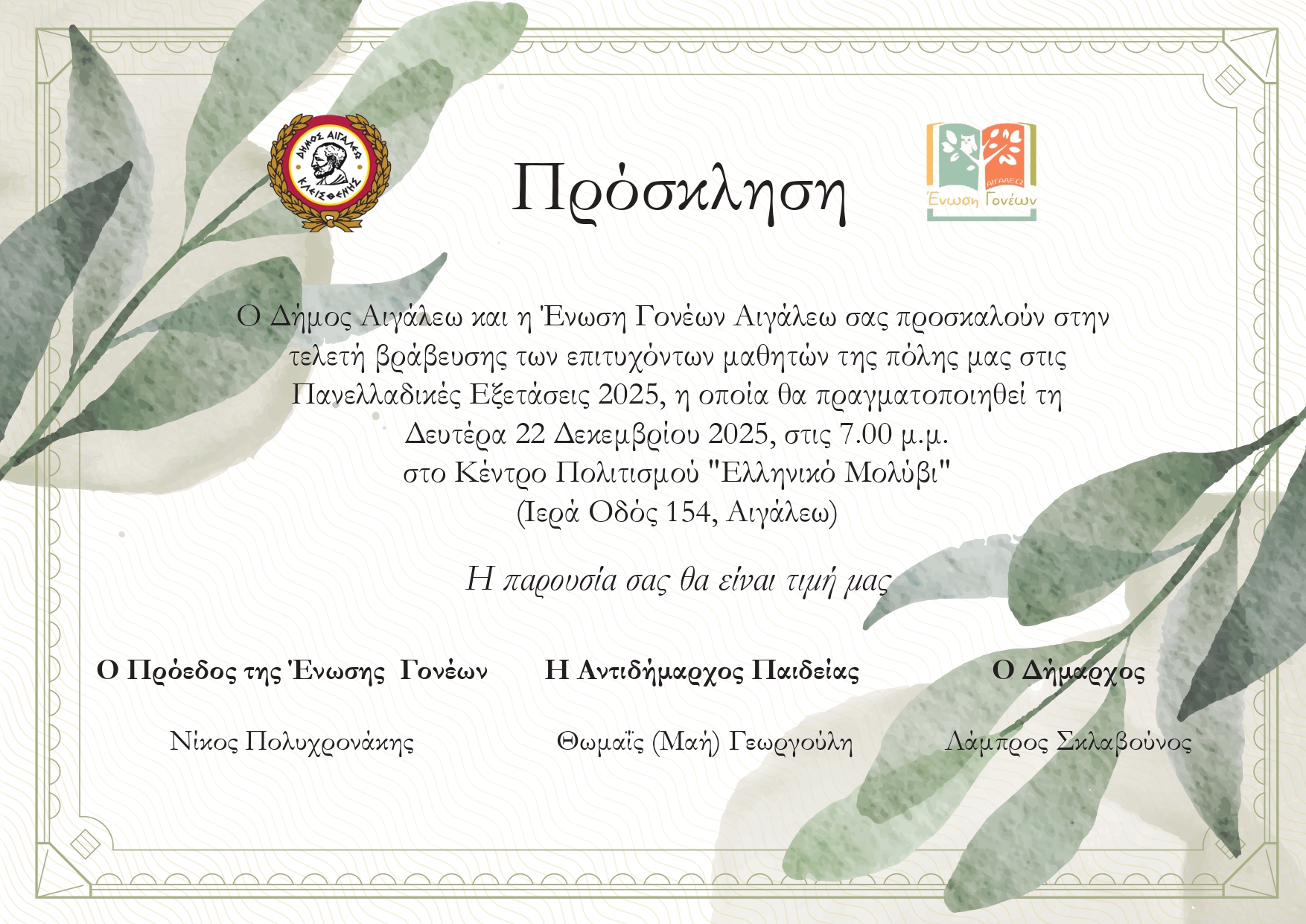 Σας προσκαλούμε με ιδιαίτερη χαρά στην Τελετή Βράβευσης των επιτυχόντων μαθητών της πόλης μας στις Πανελλαδικές Εξετάσεις 2025.