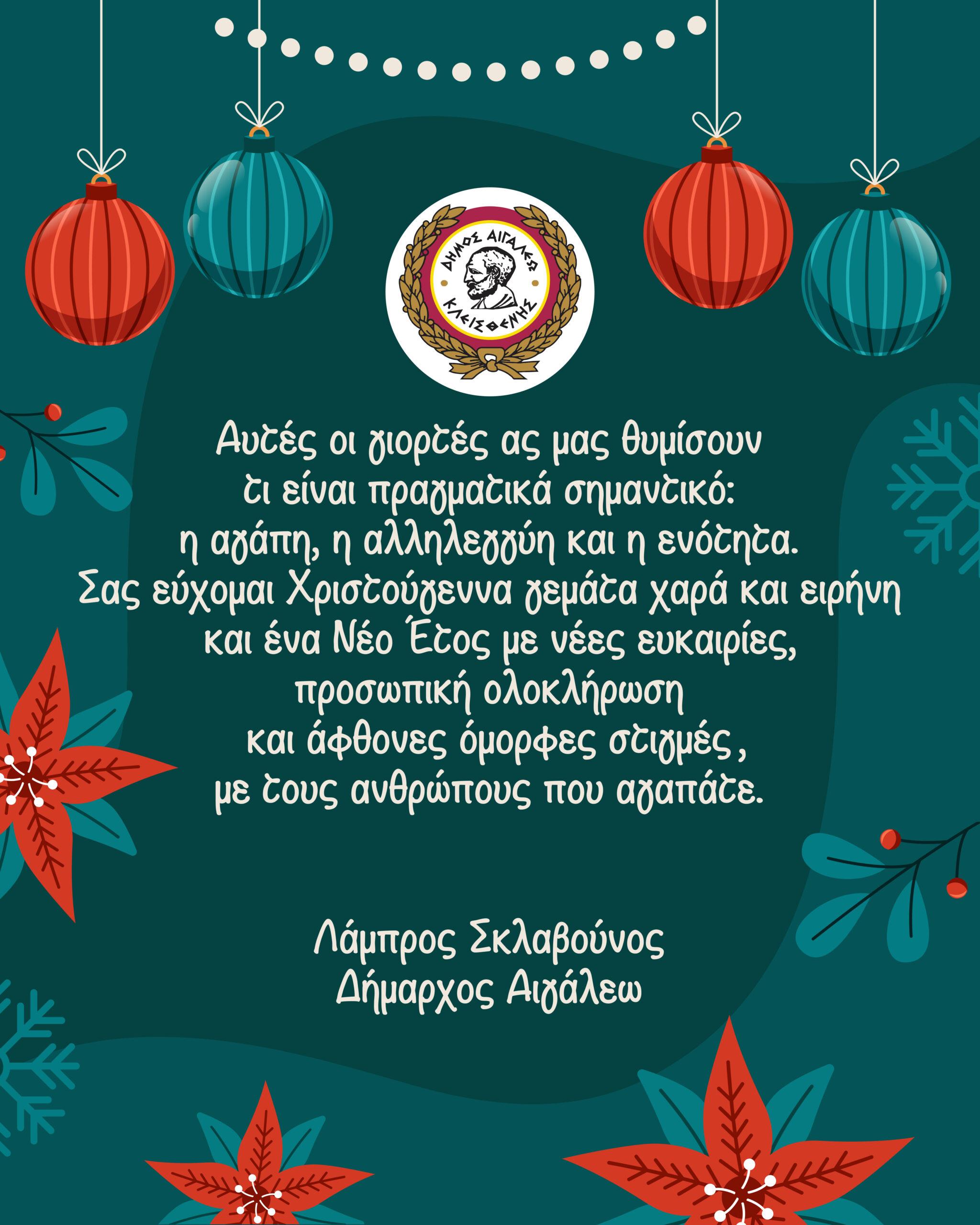 Ευχές του Δημάρχου Αιγάλεω για τα Χριστούγεννα και την Πρωτοχρονιά