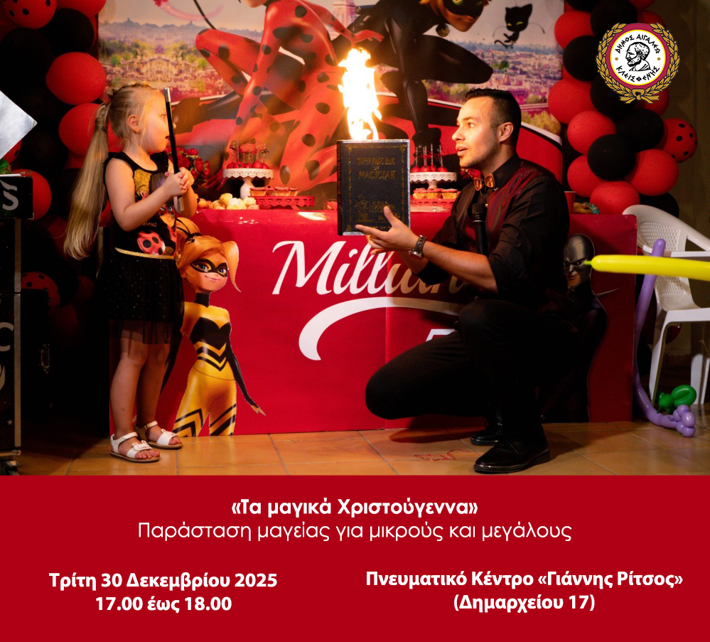Οι «Γιορτινές Ημέρες στην Πόλη μας» συνεχίζονται με μια εντυπωσιακή χριστουγεννιάτικη παράσταση μαγείας, την Τρίτη 30 Δεκεμβρίου 2025, από 17.00 έως 18.00, στο Πνευματικό Κέντρο «Γιάννης Ρίτσος», προσκαλώντας μικρούς και μεγάλους σε ένα ταξίδι γεμάτο φαντασία και έκπληξη.