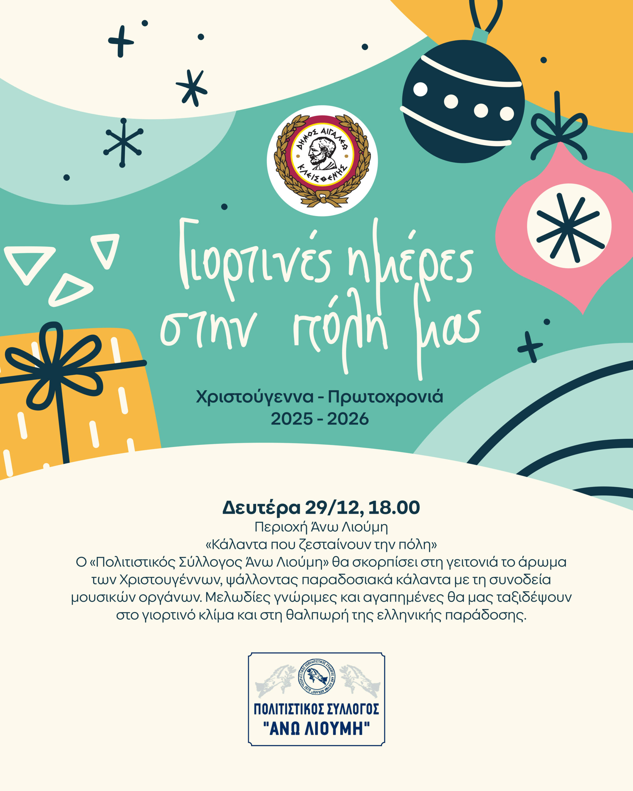 Στο πλαίσιο των «Γιορτινών Ημερών στην Πόλη μας», ο Δήμος Αιγάλεω και ο Πολιτιστικός Σύλλογος Άνω Λιούμη προσκαλούν κατοίκους και επισκέπτες σε μια ζεστή και ανθρώπινη χριστουγεννιάτικη δράση, τη Δευτέρα 29 Δεκεμβρίου 2025, στις 18.00, στην περιοχή Άνω Λιούμη.