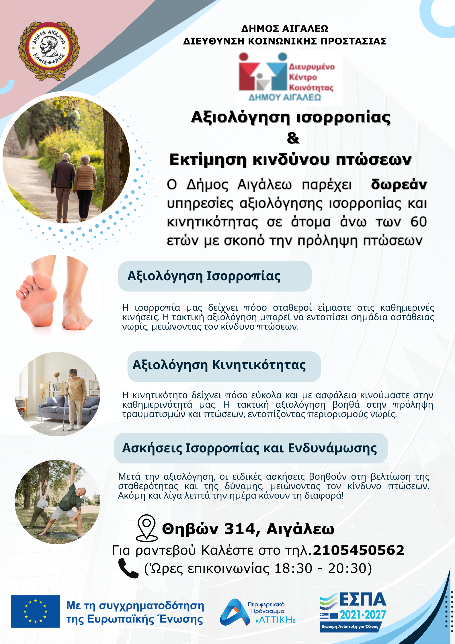Ο Δήμος Αιγάλεω, μέσω της Διεύθυνσης Κοινωνικής Προστασίας και του Διευρυμένου Κέντρου Κοινότητας, υλοποιεί μια σημαντική δράση πρόληψης, παρέχοντας δωρεάν υπηρεσίες αξιολόγησης ισορροπίας και εκτίμησης κινδύνου πτώσεων σε άτομα άνω των 60 ετών.