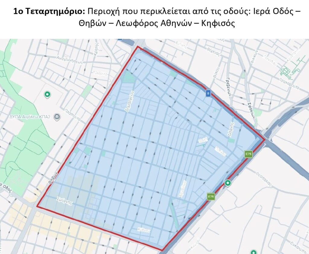 1ο Τεταρτημόριο: Περιοχή που περικλείεται από τις οδούς: Ιερά Οδός – Θηβών – Λεωφόρος Αθηνών – Κηφισός