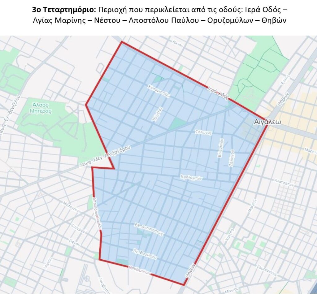 3ο Τεταρτημόριο: Περιοχή που περικλείεται από τις οδούς: Ιερά Οδός – Αγίας Μαρίνης – Νέστου – Αποστόλου Παύλου – Ορυζομύλων – Θηβών