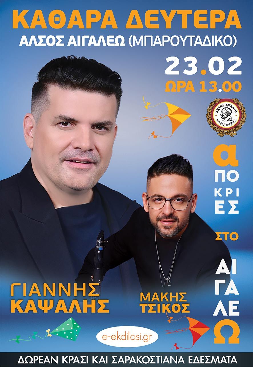 Ο Δήμος Αιγάλεω σας προσκαλεί να συμμετάσχετε στην κορύφωση των  Αποκριάτικων εκδηλώσεων την Καθαρά Δευτέρα 23 Φεβρουαρίου 2026 στο Άλσος Αιγάλεω (Μπαρουτάδικο), σε μια ξεχωριστή γιορτή που θα γεμίσει την πόλη με χαρά, παράδοση και κέφι.