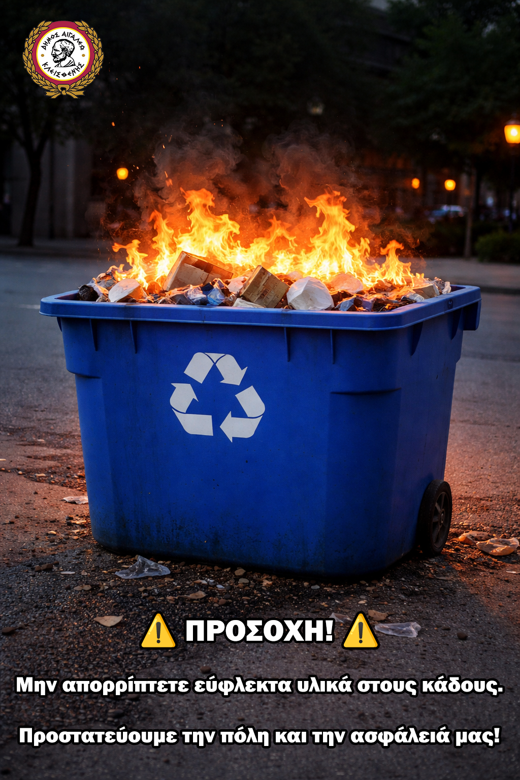 Υπενθυμίζεται ότι η απόρριψη εύφλεκτων υλικών στους κάδους απορριμμάτων, και ιδιαίτερα στους μπλε κάδους ανακύκλωσης, ενέχει σοβαρούς κινδύνους.