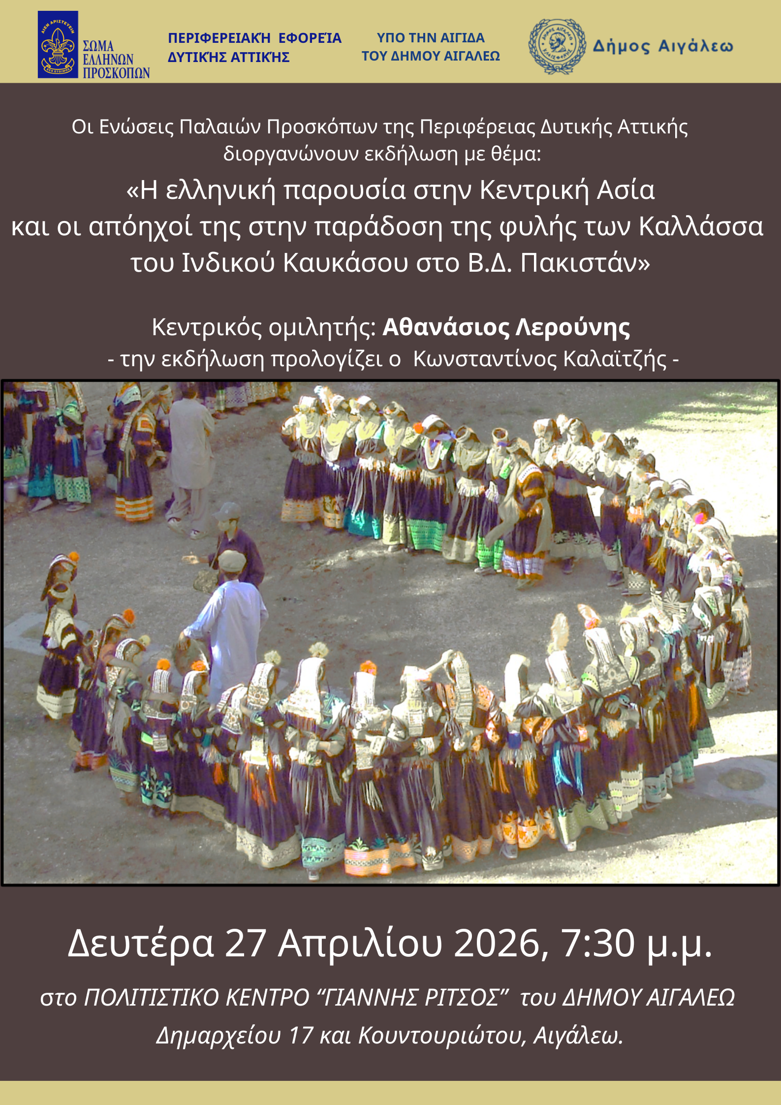 Η εκδήλωση, με θέμα «Η ελληνική παρουσία στην Κεντρική Ασία και οι απόηχοί της στην παράδοση της φυλής των Καλλάσσα του Ινδικού Καυκάσου στο Β.Δ. Πακιστάν», θα πραγματοποιηθεί τη Δευτέρα 27 Απριλίου 2026 και ώρα 19:30, στο Πολιτιστικό Κέντρο «Γιάννης Ρίτσος» (Δημαρχείου 17 & Κουντουριώτου).