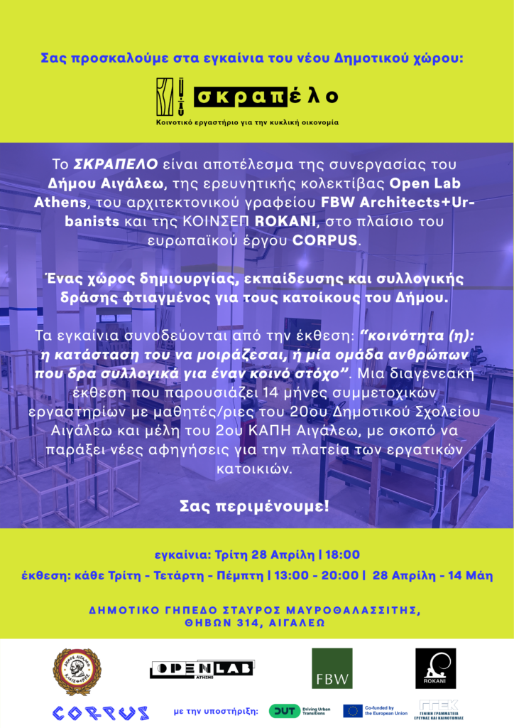 Το Κοινοτικό Εργαστήριο «Σκραπέλο» αποτελεί αποτέλεσμα της συνεργασίας του Δήμου Αιγάλεω, του Ανοικτού Εργαστηρίου Αθήνας (Open Lab Athens), του αρχιτεκτονικού γραφείου FBW και της ΚΟΙΝΣΕΠ «Ροκάνι», στο πλαίσιο του ερευνητικού έργου CORPUS.