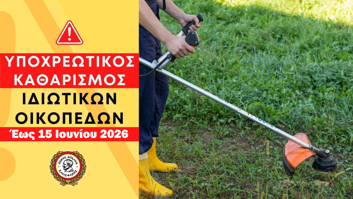 Ο Δήμος Αιγάλεω, μέσω της Διεύθυνσης Καθαριότητας & Ανακύκλωσης, ενημερώνει τους ιδιοκτήτες, νομείς, επικαρπωτές, μισθωτές και υπομισθωτές οικοπέδων και λοιπών ακάλυπτων χώρων που βρίσκονται εντός των διοικητικών του ορίων, ότι σύμφωνα με τις διατάξεις των άρθρων 41, 43 & 44 του Ν. 5281/2026, καθώς και την υπ’ αριθ. 21837 οικ. Φ.700.20/2024 Απόφαση του Υφυπουργού Κλιματικής Κρίσης και Πολιτικής Προστασίας, υποχρεούνται να προβούν στον καθαρισμό των ιδιοκτησιών τους.