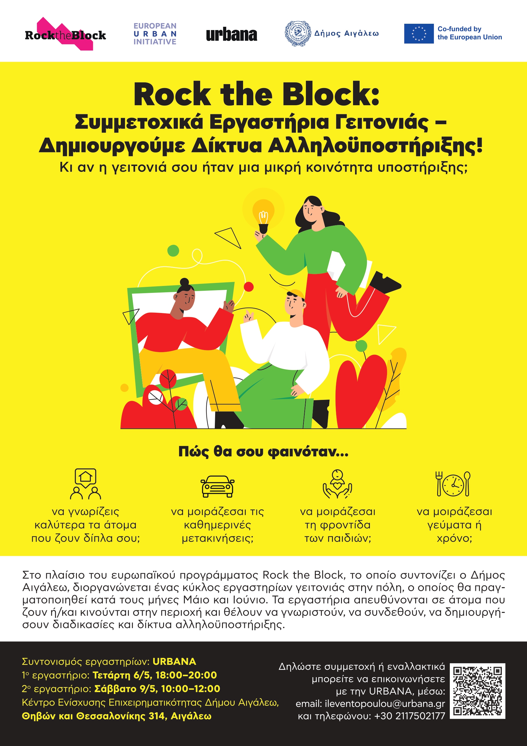 Στο πλαίσιο του ευρωπαϊκού προγράμματος Rock the Block, το οποίο συντονίζει ο Δήμος Αιγάλεω, ξεκινά ένας νέος κύκλος εργαστηρίων γειτονιάς στην πόλη. Τα εργαστήρια απευθύνονται σε άτομα που ζουν ή/και κινούνται στην περιοχή και θέλουν να γνωριστούν, να συνδεθούν και να δημιουργήσουν διαδικασίες και δίκτυα αλληλοϋποστήριξης.